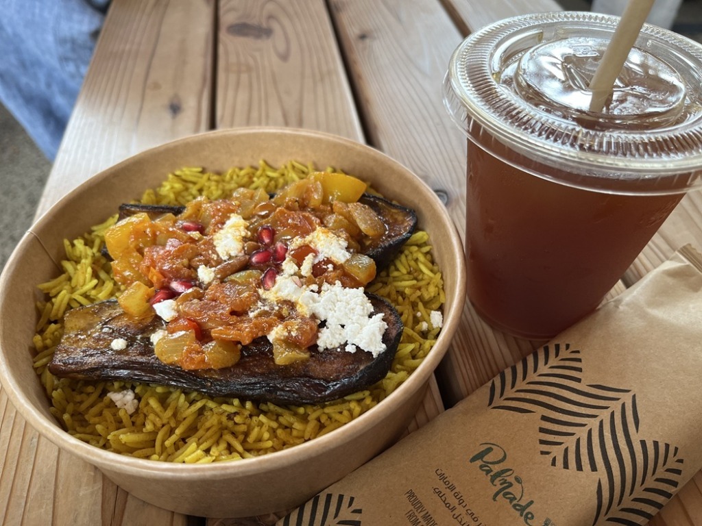 マチュブースというアラブ風ピラフ、ビリヤニみたいなのの上に、ナスのグリル、ダッコウソース(スパイシーなトマトソース)が乗ってるんだけど。めっちゃ美味しかった。