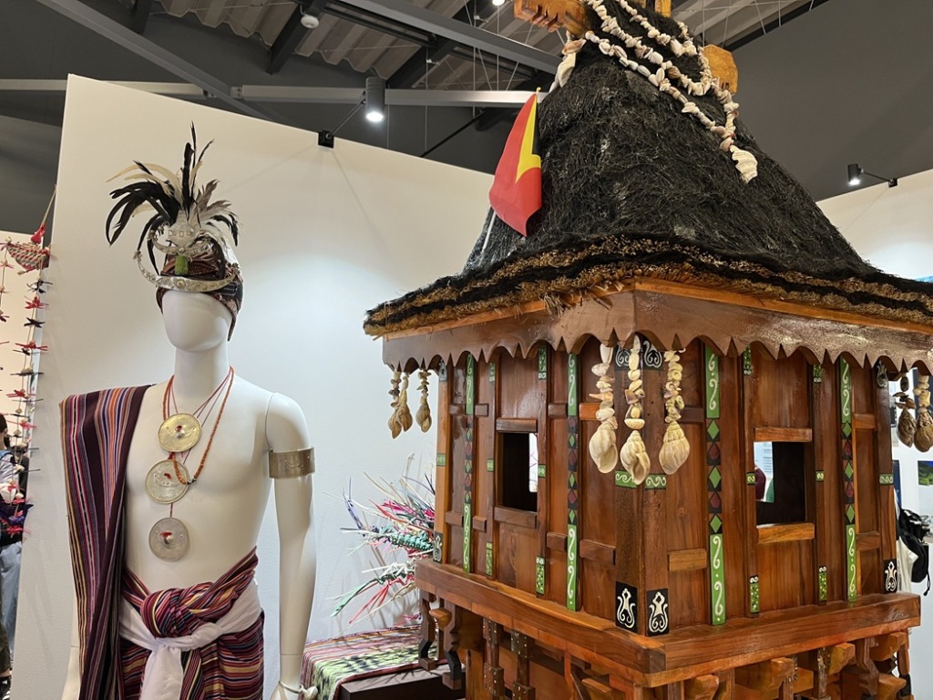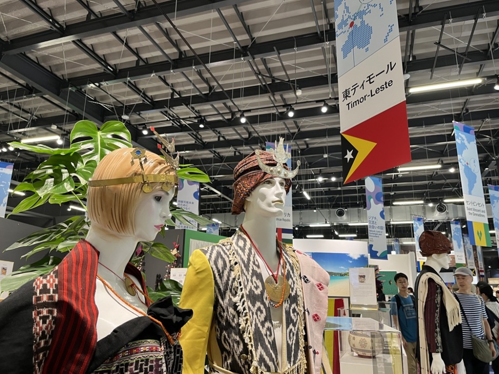 他のところにあった東ティモールの民族衣装も髪飾りが印象的だった。男女のマネキン、お互い目線は合わさない強い意志みたいなのを感じるわ。