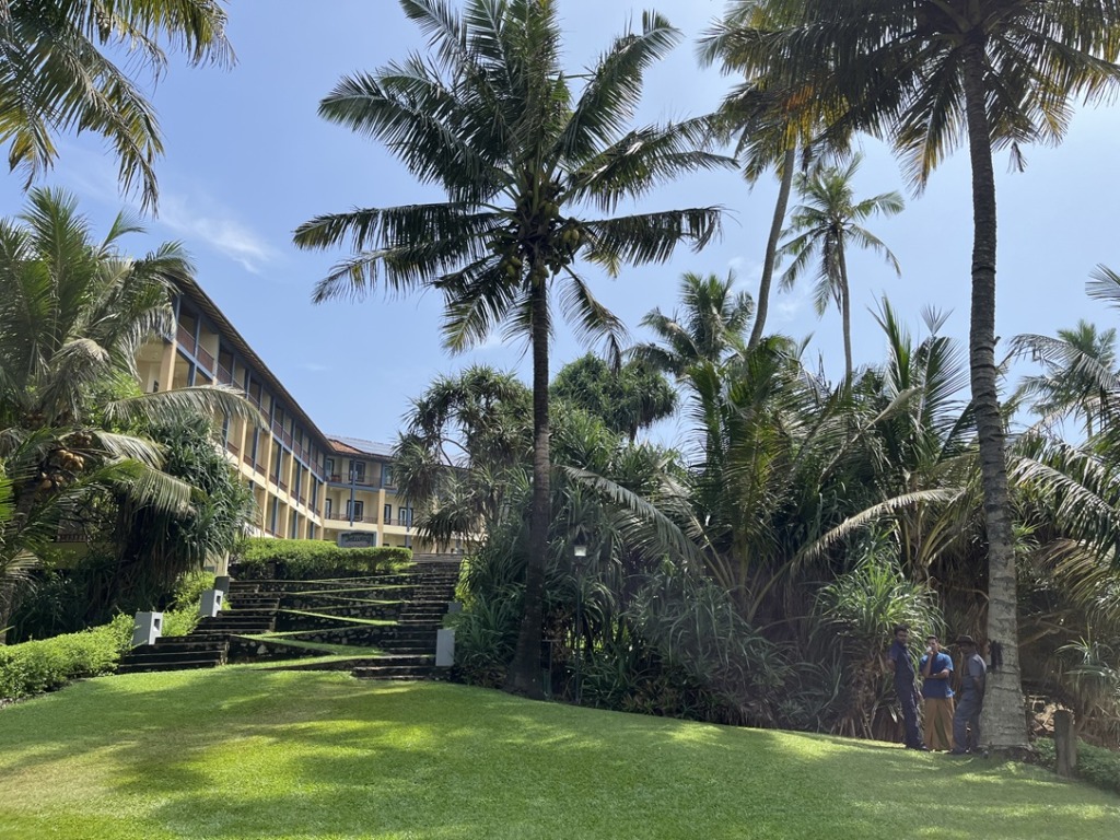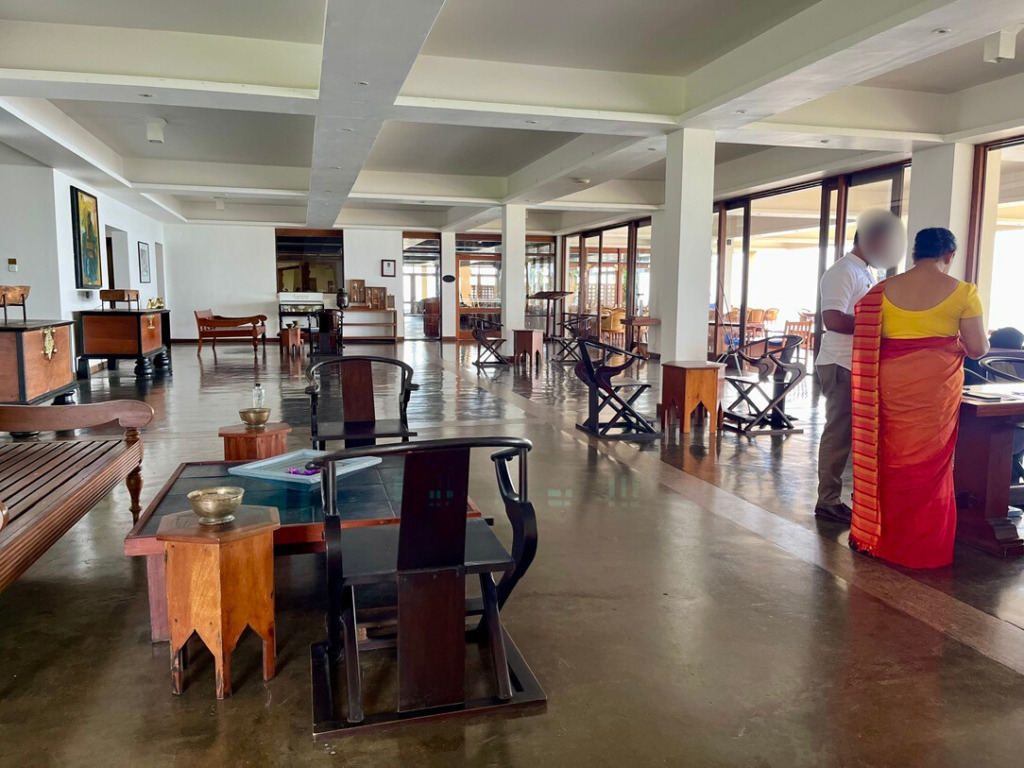Jetwing Lighthouse(ジェットウィング・ライトハウス)は、バワ晩年に手掛けた海辺沿いのホテル。観光途中に寄ってもらったよ。ホテルの人に聞いて、見学だけでもよいってことで、ホテルの中へ。