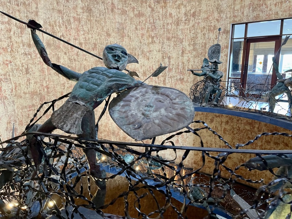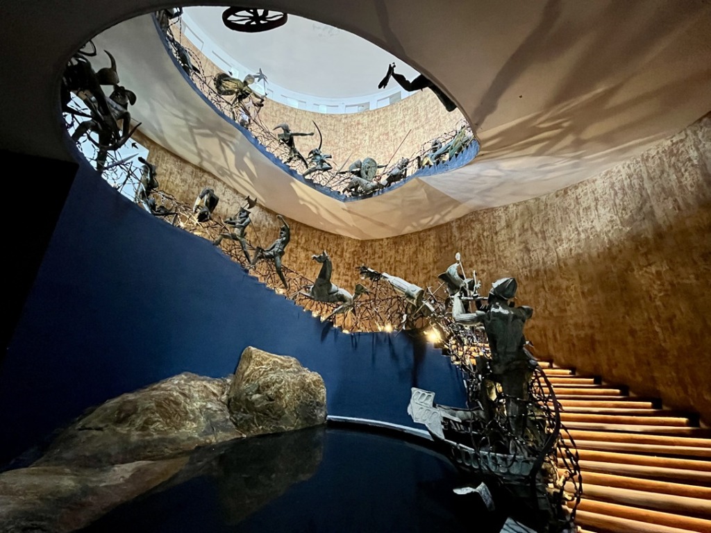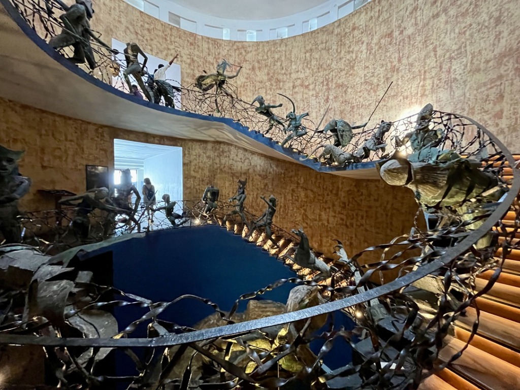 ホテルに入って、ビックリ!螺旋階段にアート作品!スリランカの彫刻家ラキ・セナナヤケが、17世紀に起きたポルトガル軍とシンハラ王朝の戦いを表現したものだそう。